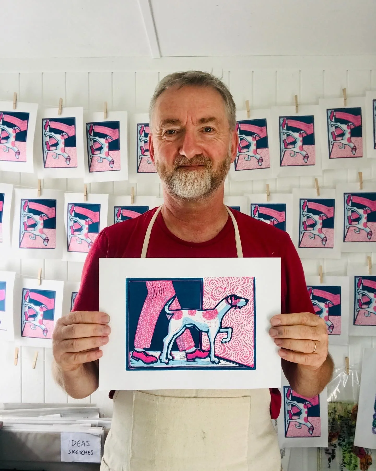 Hampshire-based artist and printmaker Mark creates contemporary linocut prints and paintings inspired by suburban life, walking, and local history. His artwork reflects themes of place, memory, and community connection, often featuring recurring motifs such as dog walkers, neighbourhood streets, and everyday scenes that capture the rhythm of British community life.