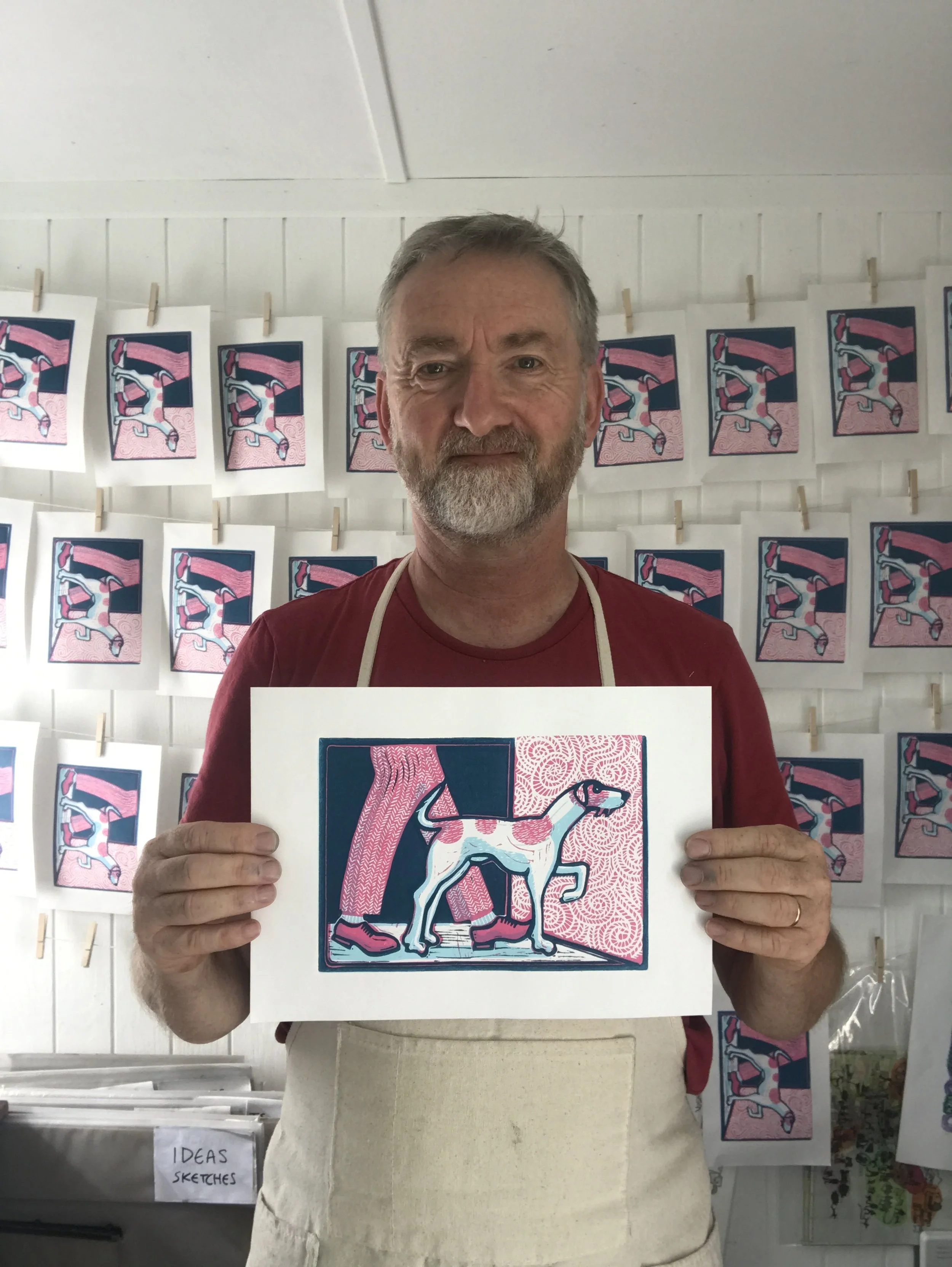 Cut Loose (Scent) is a limited edition handmade linocut print celebrating the joy of fresh beginnings and the bond between human and dog. The artwork features Bruce, a beloved rescue dog, alongside a figure in brogues and tweed trousers, symbolising freedom, companionship, and stepping into the fragrant air of new possibilities.
